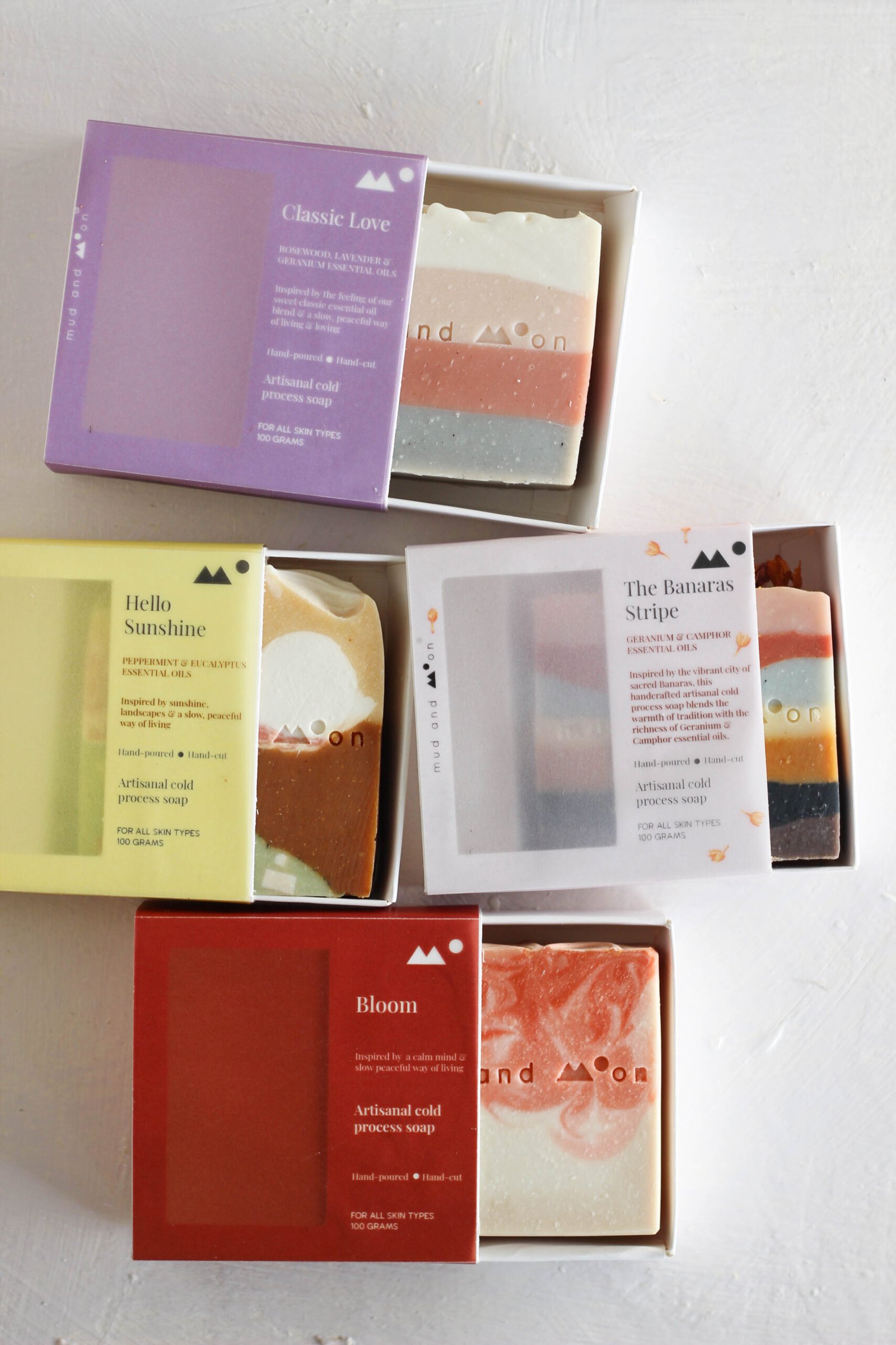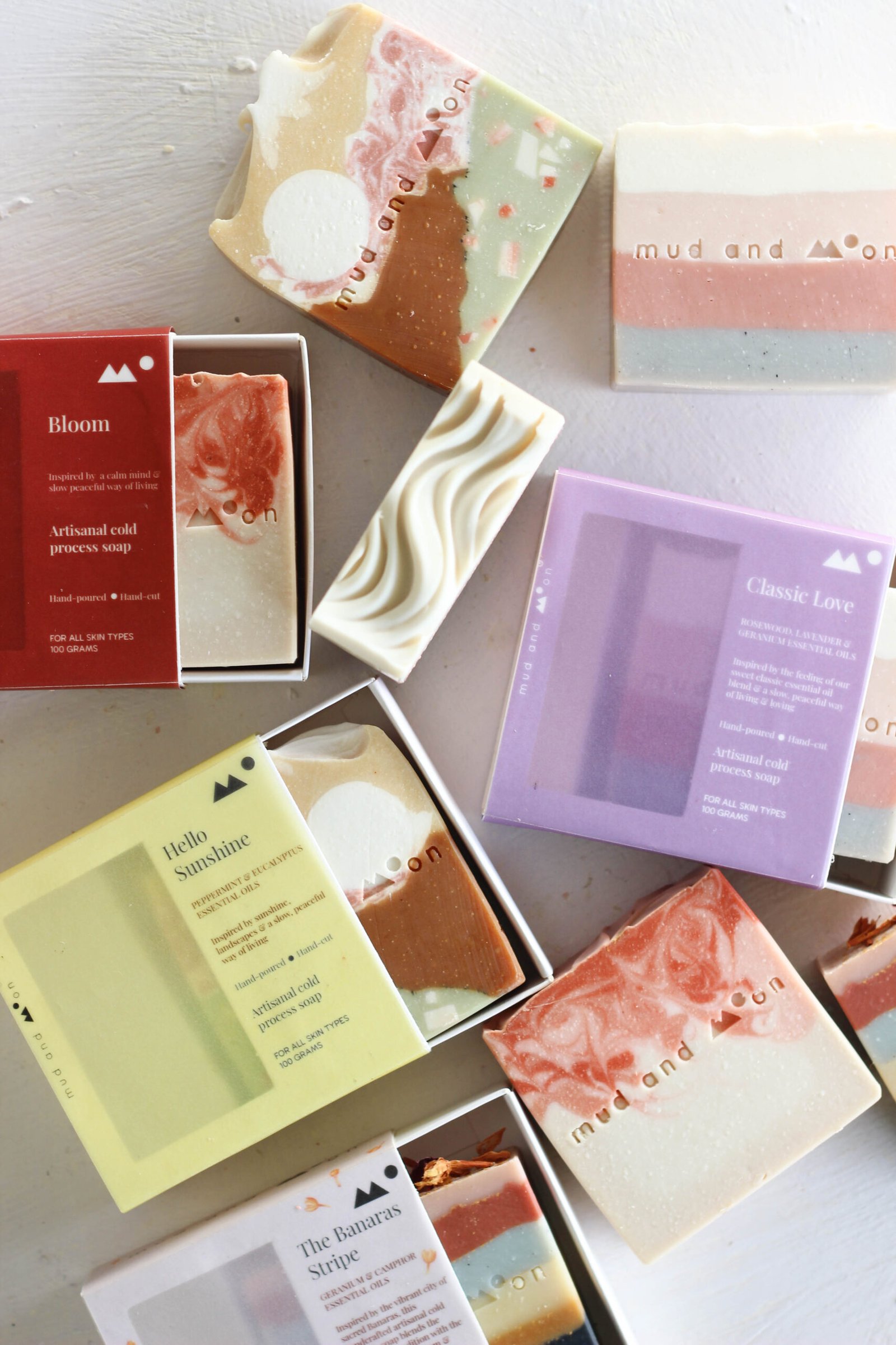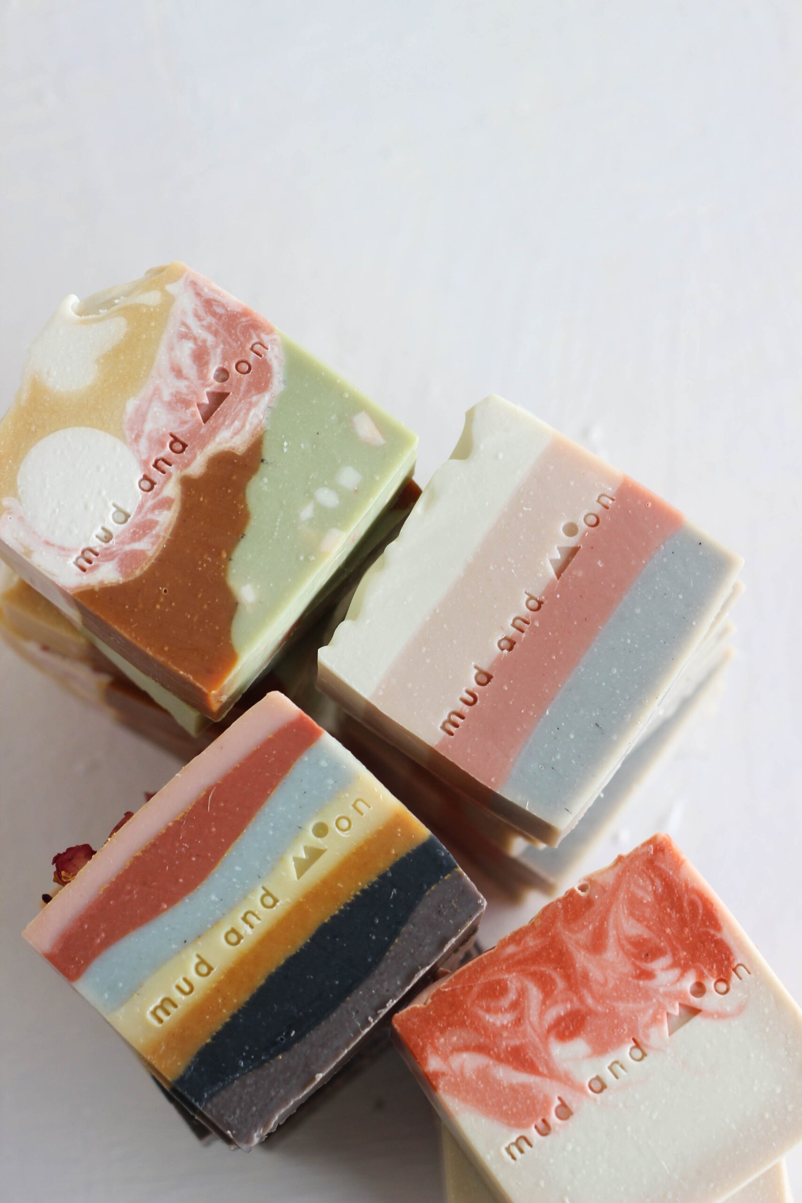 Mud and moon soaps are made by hand in small batches to ensure quality. Products may show slight variance in design & colour from photos due to their handmade nature. Due to the organic nature of process we follow to make our soaps, each soap will be unique in design.