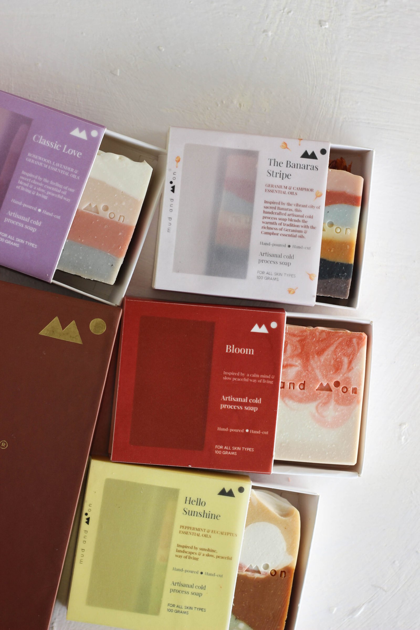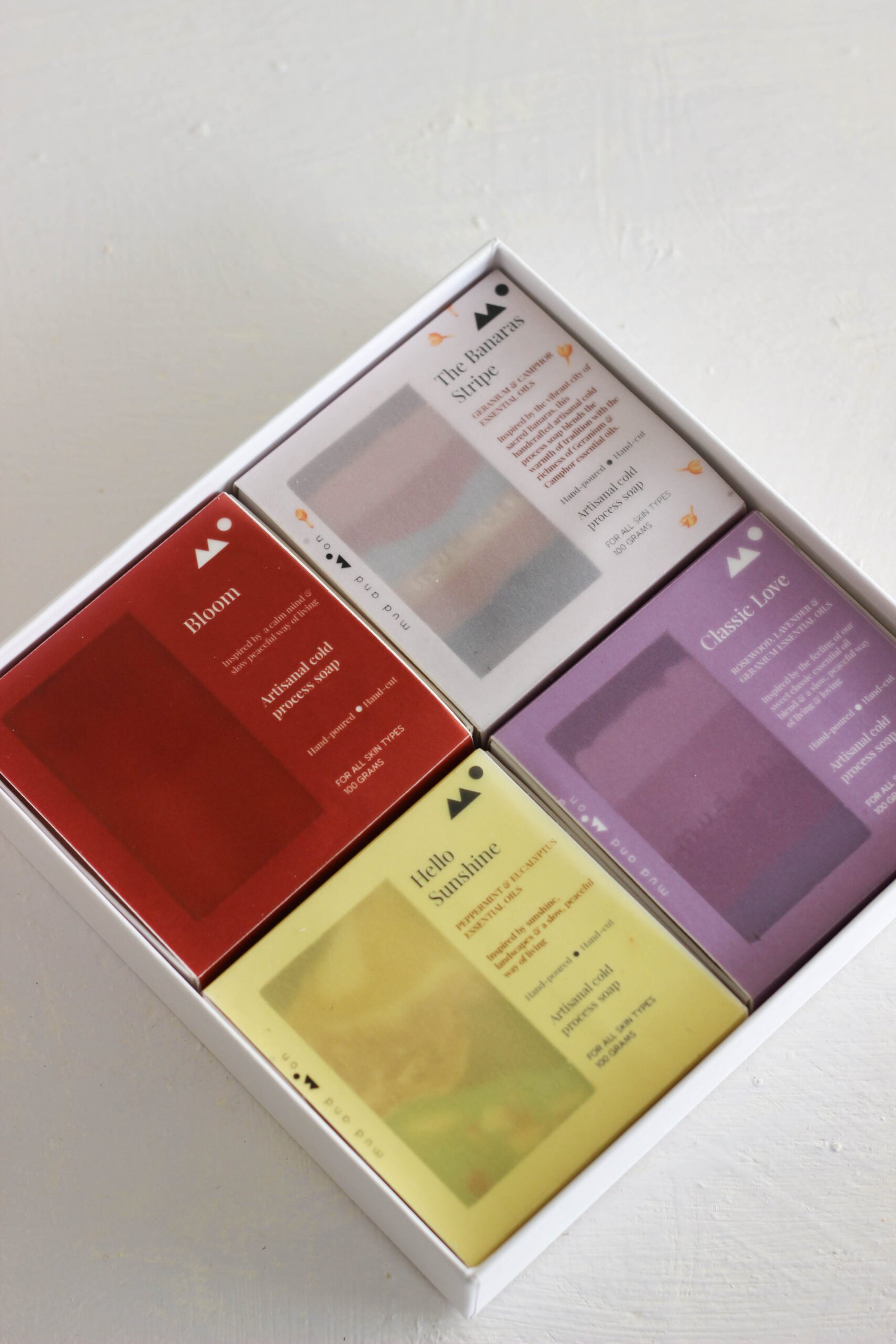 This special brown box contains a collection of 4 limited edition artisanal cold process soaps.